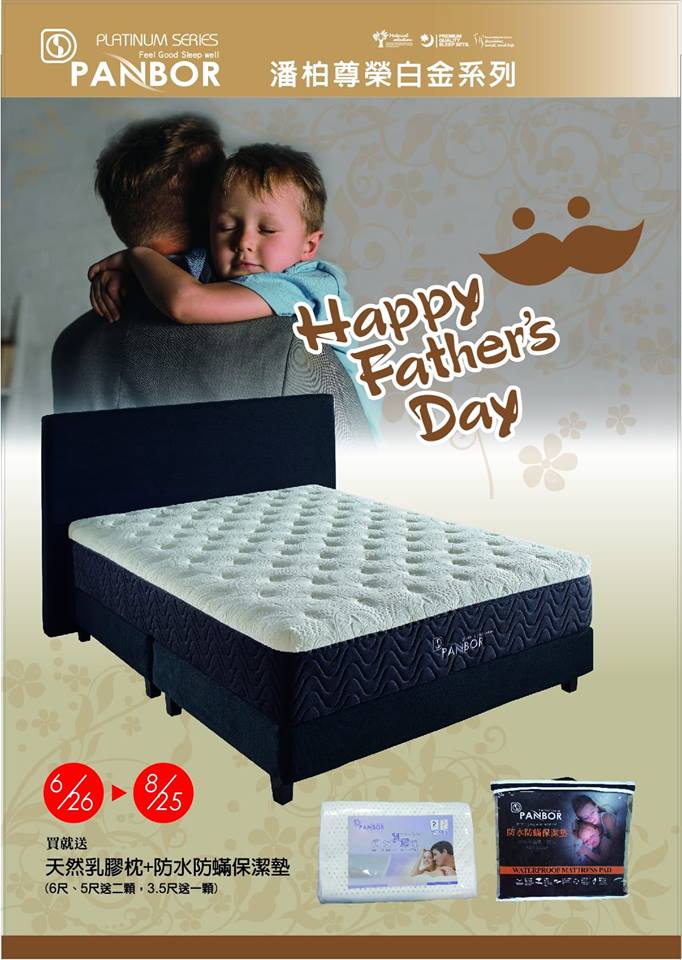 八月份是感恩的季節,最好的床墊獻給最偉大的父親,潘柏名床尊榮白金系列為慶祝父親節活動,推出買床送好天然乳膠枕跟防水保潔墊,做為獻給爸爸最好的父親節禮物!!!