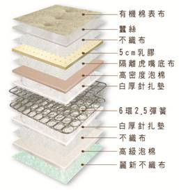 採用中鋼頂級高碳錳鋼材,經高溫熱處理定型,由20年生產經驗之師傅以純手工方式 打造出特殊6環超硬彈簧。搭配最新科技之低溫高拉力防陷針扎白綿墊進行防陷處理。彈簧耐用性在正常使用下,保証10年以上不變形。